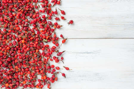 Berries of red rose hips useful for health on a wooden surface