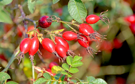 Detail of a dog roses ripe red fruits.