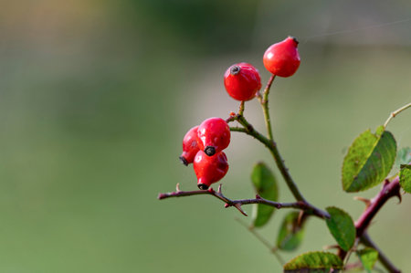 winter red rosehip berries on a branch with thorns on a green background, close-up