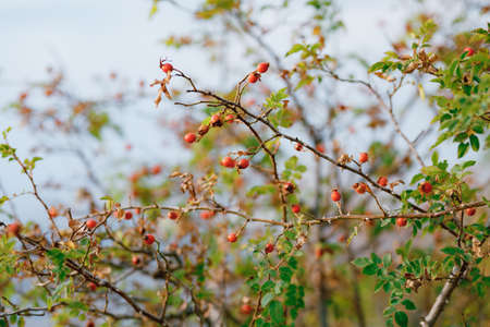 Branches of ripe rose briar hips in autumn. Countryside scene of harvesting