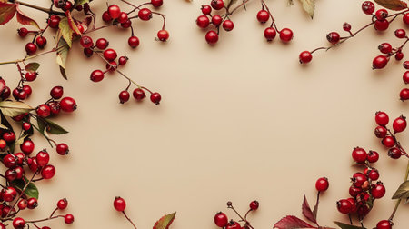 Red berries cranberry and leaves on beige background, autumnal composition. Nature and seasonal decoration concept.