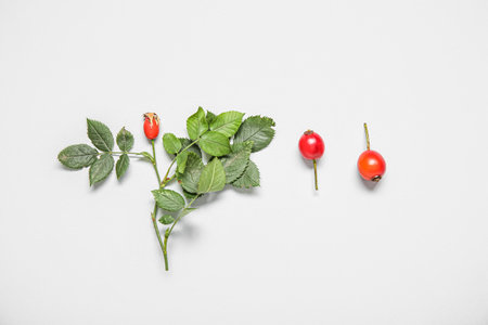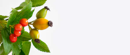 ripe fresh rosehip berries on twigs with green leaves on a white background, space for text