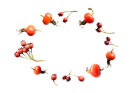 White background with isolated wild autumn Russian Far East berries of hawthorn, rose hips. Copy space, oval frame. effect of thrown up berries