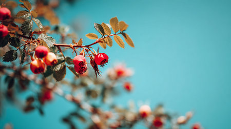 Red rosehip berries on a branch with leaves on a blue background