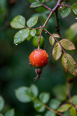 Ripe rosehip berries on a branch with dew drops.