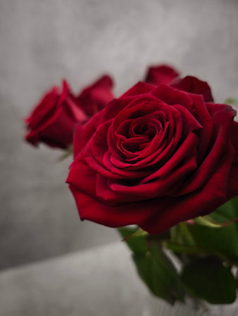 A stunning arrangement of fresh red roses against a soft gray background. Perfect for themes of love, romance, and elegance in any design.