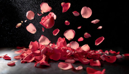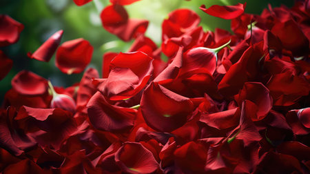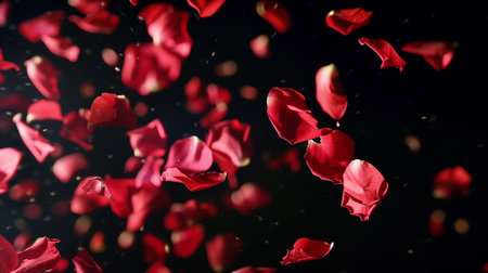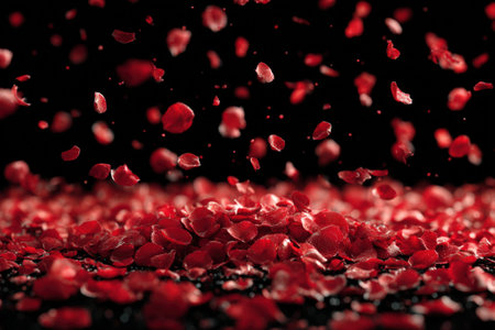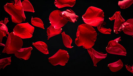 Scattered red rose petals create a stunning visual pattern against a dark backdrop, emphasizing texture and color, perfect for romantic themes and celebrations
