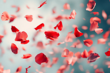 Red petals drift softly against a bright blue sky creating a serene and romantic atmosphere. The petals swirl and dance as they descend gently towards the ground.