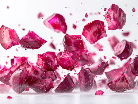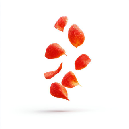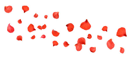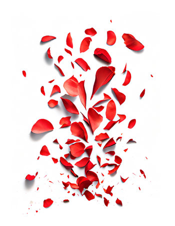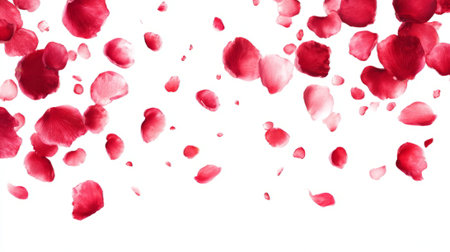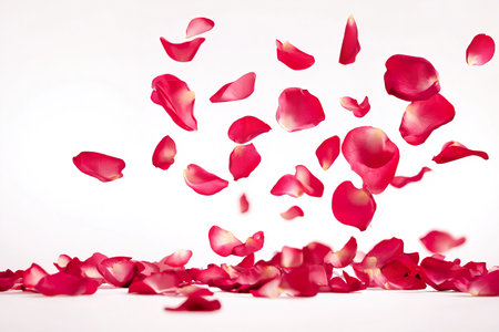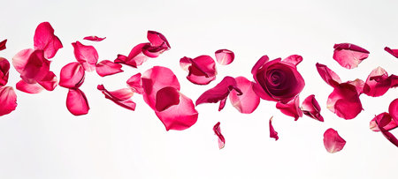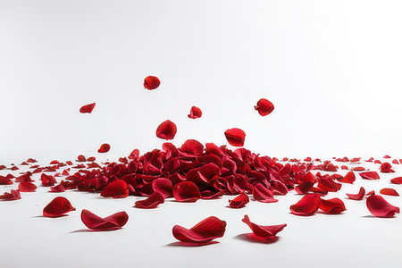 A stunning display of red rose petals floating elegantly against a clean white backdrop, emphasizing beauty and softness, perfect for romantic themes.