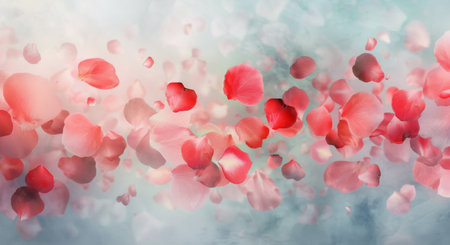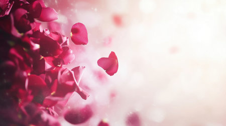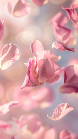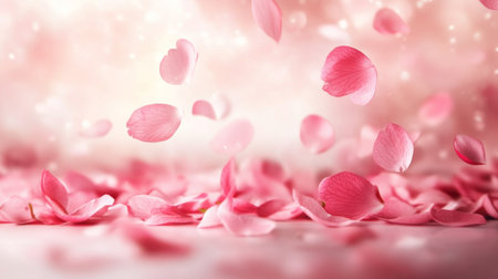 Pink rose petals scatter and float in a gentle breeze their pastel hues and soft focus creating a delicate, serene scene full of natural beauty and romantic charm