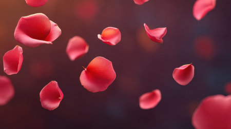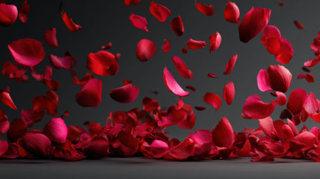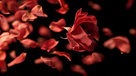 A breathtaking and truly beautiful display of falling red flower petals swirling gracefully in the air, perfectly capturing the essence of lovely spring and natures vibrant, lively colors