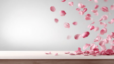 Ethereal pink flower petals cascade softly onto a light wooden surface, evoking feelings of romance and tranquility, perfect for projects requiring a delicate touch.