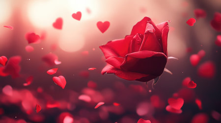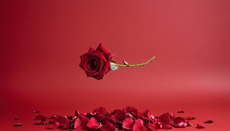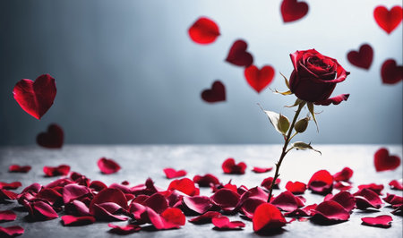 A single red rose stands tall against a gray backdrop, surrounded by fallen petals shaped like hearts
