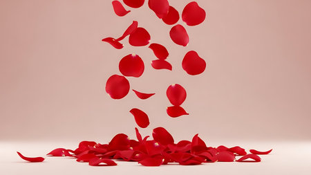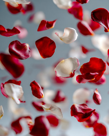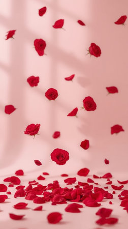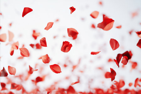 A cascade of vibrant red rose petals falling against a soft, blurred white background, creating a romantic and celebratory atmosphere.