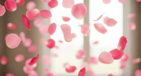 Elegant pink rose petals drift gently in a soft blur, ideal for conveying love, beauty, and romance in designs for weddings, celebrations, and special occasions.