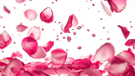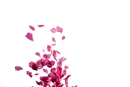 Deep pink rose petals in frozen motion from bottom to top isolated white space above and right white background perfect for background texture