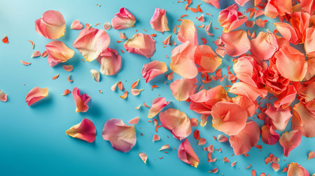 An artistic arrangement of scattered rose petals in shades of pink and orange on a blue background, creating a beautiful and romantic composition.