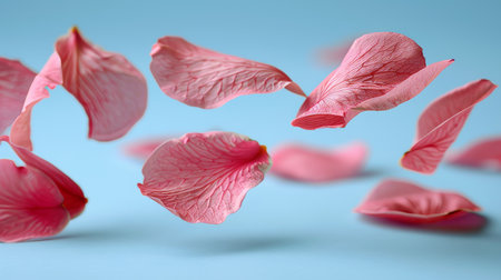Pink rose petals gently float in the air against a soft blue sky, creating a serene and captivating scene that blends delicate beauty atmosphere