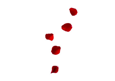 Red rose petals fall to the floor on a white background.