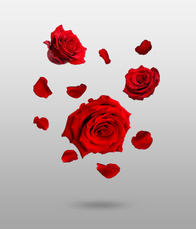 Red roses and petals falling on gray background