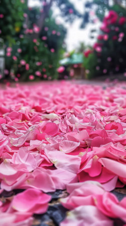 A beautiful image of rose petals scattered on a stone path, with soft-focus flowers and petals in the background.