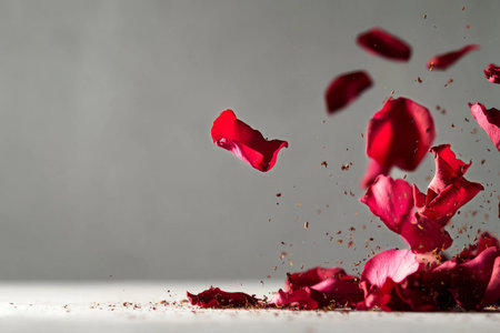Red rose petals are being gracefully scattered on a smooth surface, creating a dramatic visual against a neutral backdrop, emphasizing their vibrant color and soft texture.