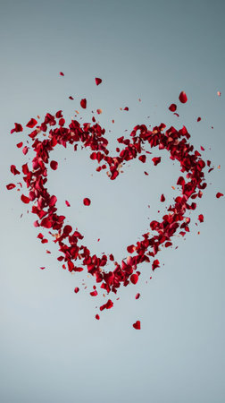Delicate red rose petals forming a heart shape against a soft light blue backdrop create a romantic and elegant visual for valentines day or spring celebrations