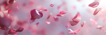 Pastel pink rose petals drift and scatter in a gentle breeze, their soft focus adding to the serene, romantic ambiance of this delicate and enchanting scene banner