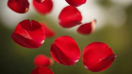 A close-up view captures several vivid red rose petals in motion, appearing to fall and float against a softly blurred green background. The natural sunlight filters through the petals, creating subtle highlights and shadows that reveal their delicate veins and curved edges. The background is a soft wash of green, suggesting an outdoor, natural setting, with bokeh effects adding to the dreamy and romantic atmosphere. The focuses on the vibrant color and graceful movement of the petals.