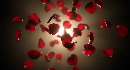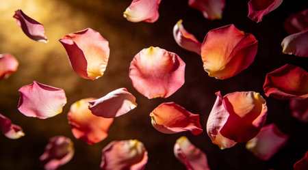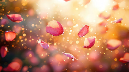 Delicate rose petals drift through the air, illuminated by soft sunlight, creating a romantic atmosphere filled with warmth and beauty.