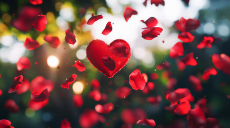 Romantic Heart Surrounded by Falling Red Rose Petals Concept of Love Passion Romance and Valentine's Day Festivity. Copy space.