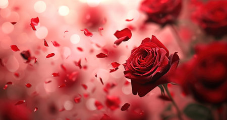 Elegant arrangement of blooming red roses and scattered petals in a diagonal composition, symbolizing romance, beauty, and celebration.