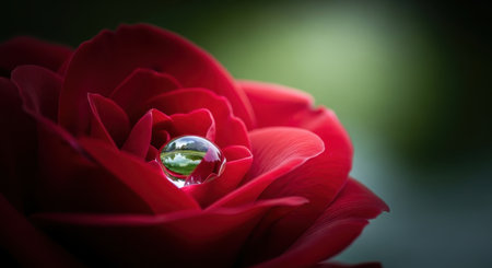 Velvety red rose petal with a perfectly spherical dewdrop at its center, reflecting a vibrant green landscape. a dramatic close up macro shot highlighting nature beauty and freshness.