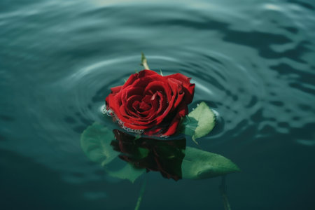 heart-shaped red rose floating on clear pool of water, created with generative ai