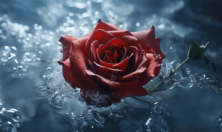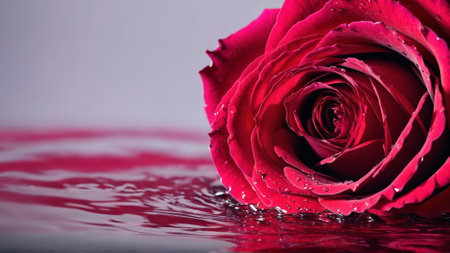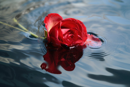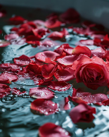 Beautiful red rose petals floating in water with drops of water. Valentine's day romance