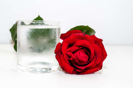 Rose in glass of red liquid creating crown splash. Flower art photography. Creative still life photography concept.