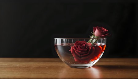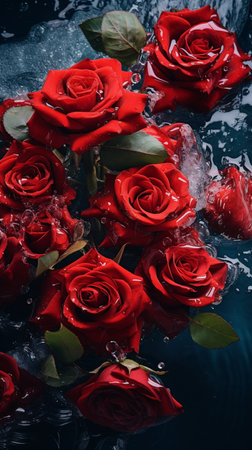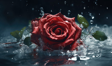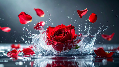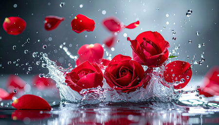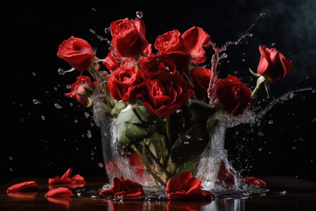 red roses in a vase, with water splashing on the petals, created with generative ai