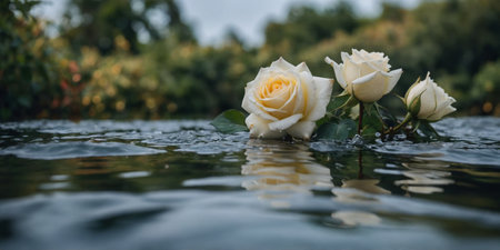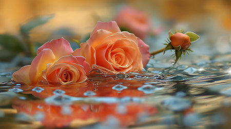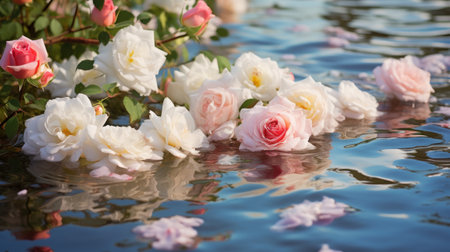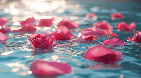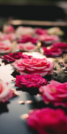 Pink roses and petals floating on the surface of calm water, creating a peaceful and serene composition that evokes a sense of tranquility.