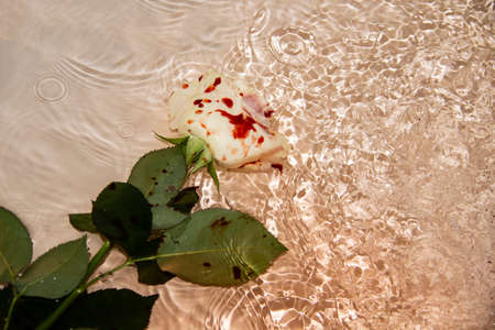 Beautiful and bloody on the water. Bloody rose on the water. White rose with blood