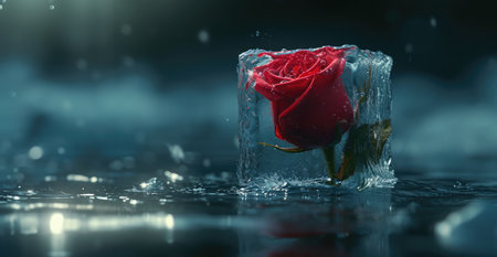 Generative AI, frozen red rose flower in ice cube, greeting card or banner with copy space