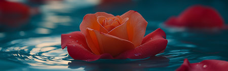 A beautiful orange and pink rose floating on calm water, surrounded by scattered petals