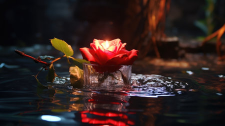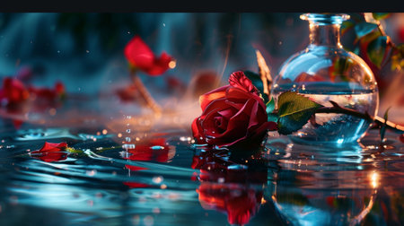 A delicate red rose floating on water, with a glass bottle in the background, creating a dreamy and romantic atmosphere with soft lighting and reflections on the water.