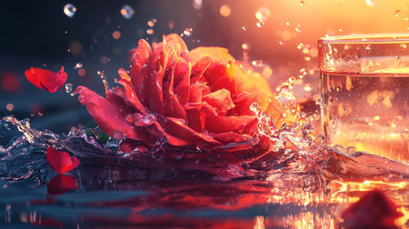 A stunning macro shot of a red rose surrounded by water splashes, illuminated by golden sunlight, creating a romantic and vibrant atmosphere.