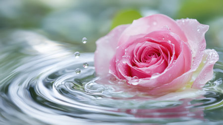 A stunning close-up of a pink rose flower gently floating on clear water, creating soft ripples. The image captures the essence of nature's beauty and tranquility.