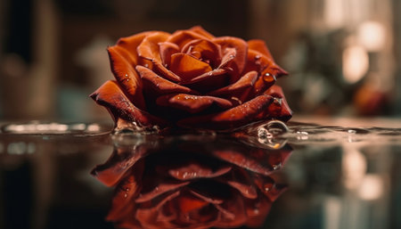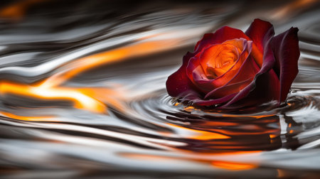 A stunning red rose floats gracefully on water, its petals reflecting warm orange light. This serene scene captures the beauty of nature and tranquility.
