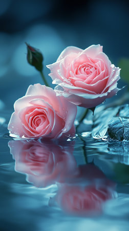 Elegant pink roses floating on water with a soft blue background, evoking feelings of serenity and romance.