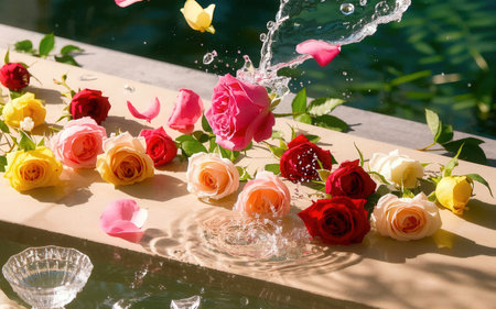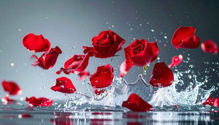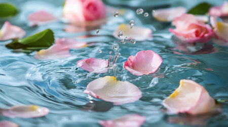 Gentle rose petals float gracefully on a calm water surface, creating a soothing visual. A delicate splash adds an element of freshness and tranquility to this serene scene.