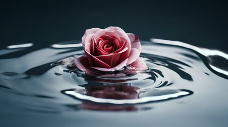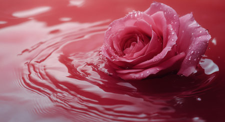 A pink rose rests on the surface of rich red water, surrounded by gentle ripples. The scene captures the essence of tranquility and beauty, highlighting the rose's elegance.