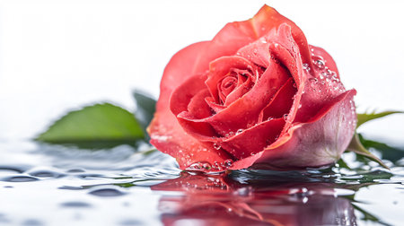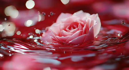A vibrant pink rose emerges from a tranquil surface, where water droplets splash around it, surrounded by soft red petals, creating a peaceful and romantic ambiance.