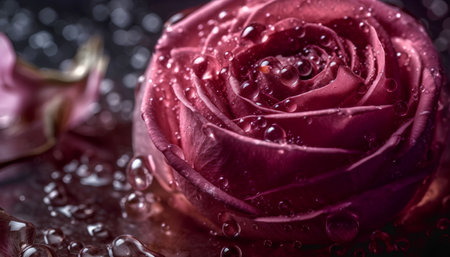 A close-up of a blooming rose with dew drops delicately resting on its petals, showcasing the intricate layers and vibrant color, symbolizing beauty and freshness.